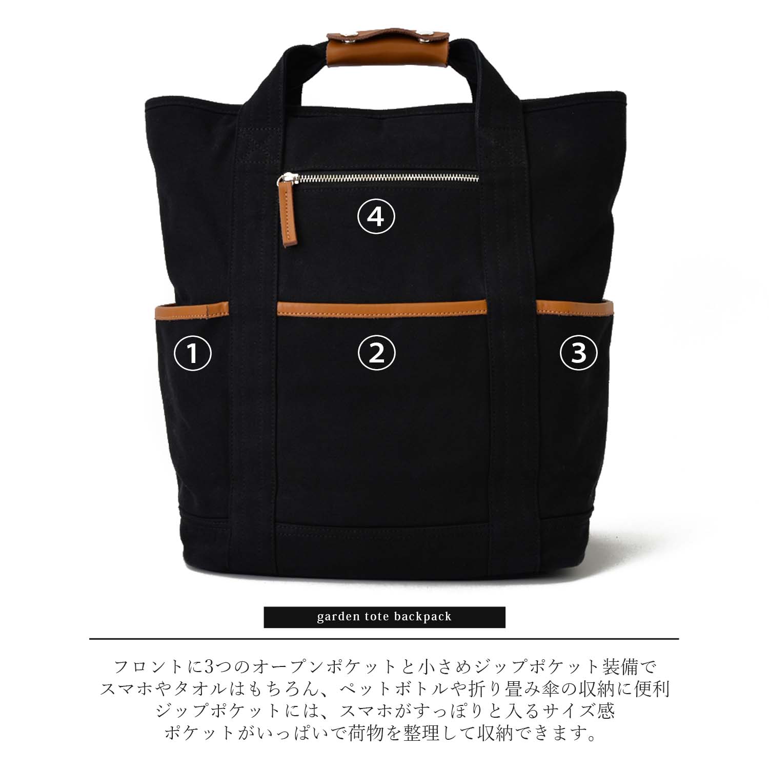カジュアルテイストに牛革使用で高級感をプラスした大容量2WAYガーデントートリュック。