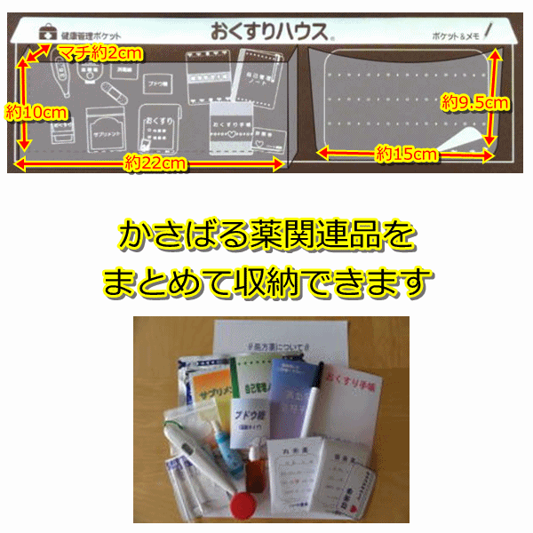 おくすり手帳や自己管理ノートなどの冊子、厚みのある軟膏や血糖値計などまで入って取り出しもラクラク! ・ポケット&メモ ちょっとしたものの収納だけでなく、ビニル部分にメモすることもできる、2wayの欲張りポケット! 体温・血圧の記録、病院や薬局の緊急連絡先を記入しておくこともできます。